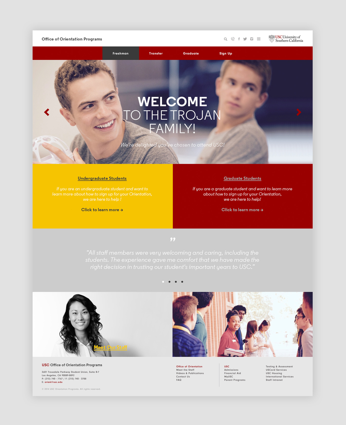 Previous websites for USC Orientation were full of information, but lacked the excitement of real students. We brought the user’s peers to the forefront with imagery that shows students having the time of their lives, team profiles that are full of quirky personality, and copy that features the student voice in quotes throughout the site. The sum total is an experience in which all are welcome, everyone is welcoming, and the user’s own excitement is reflected back at them. Which is another way of saying “t.g.u” (for everyone over 30, that means “totally get you”).