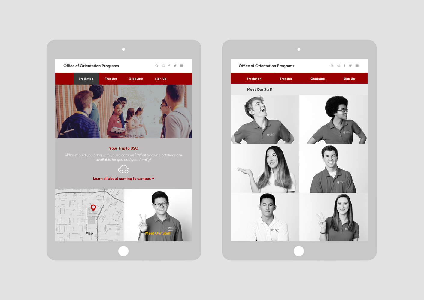 Multiple times a year, USC welcomes thousands of new students to its campus. The Office of Orientation is tasked with creating programs that help the new undergraduate and graduate students meet their new community, and form their new home away from home. We were tasked with creating the digital experience for USC Orientation, and an easy to use, mobile-friendly site for a population bubbling with excitement and rife with anxiety.